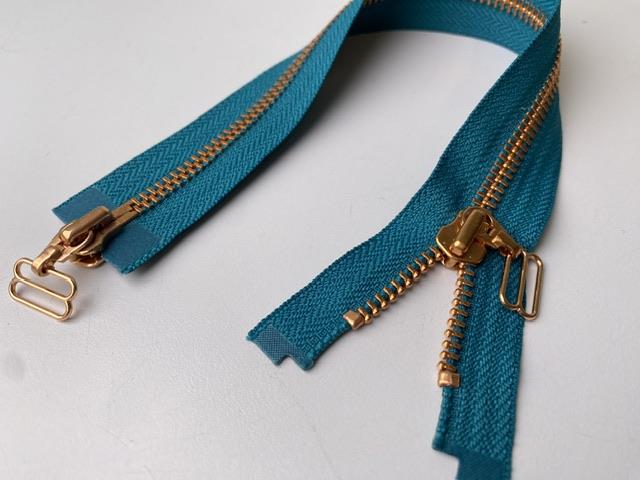 Lynlås - 2-vejs, petroleumsblå med rose gold metaltænder, 29 cm