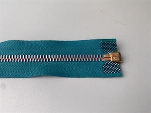 Lynlås - delbar, petroleumsblå med rose metaltænder, 23 cm