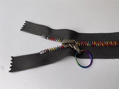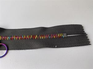 Lynlås - ikke delbar, sort med multifarvede metaltænder, 13 cm