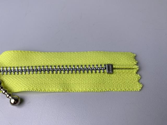 Lynlås - ikke delbar, neongul med sølv metaltænder, 11 cm