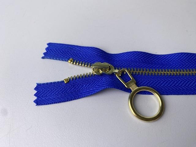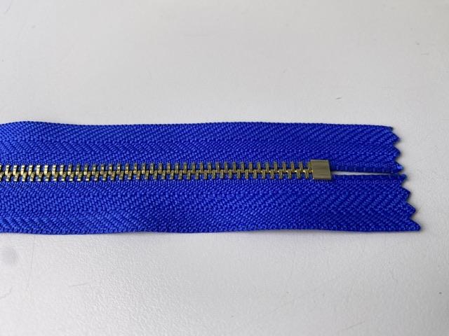 Lynlås - ikke delbar, intens blå med guld metaltænder, 15 cm