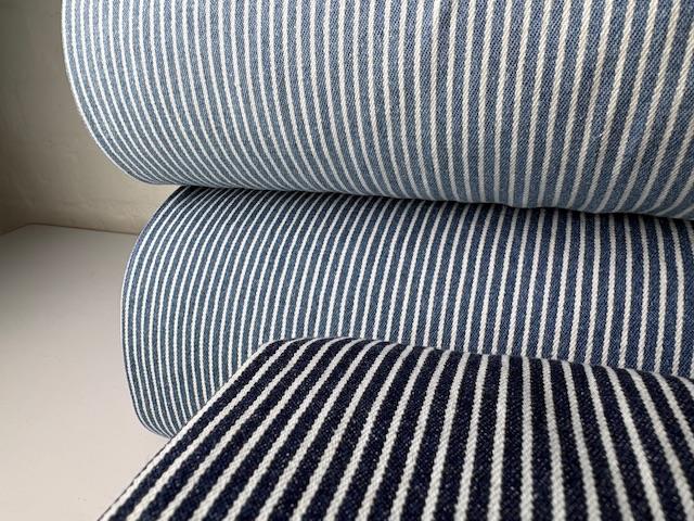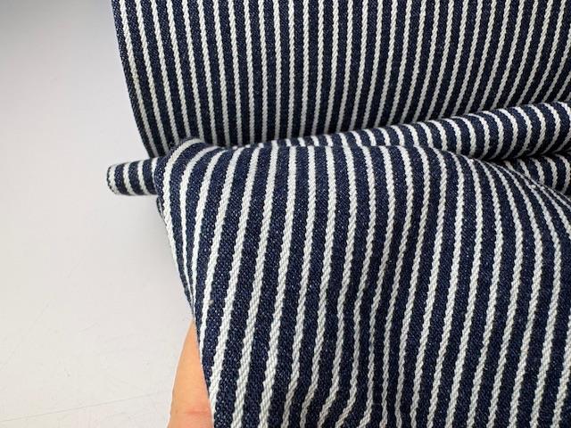 Lækker fastvævet denim med fine mælkedrenge striber i mørkeblå og offwhite. Rigtig flot og klassisk cowboystof med striber. Stoffet er med stræk og velegnet til bukser, shorts, sommerjakke, buksedragt...