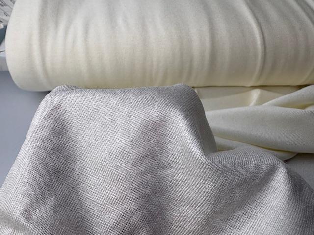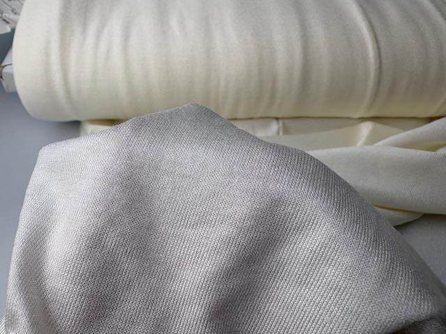 Lækkert parti med skønne kvaliteter. Det er dansk produceret og i spændende kvaliteter vi ikke har set før. Her en luksus tosidet polyesterjersey med viscose i flot offwhite.