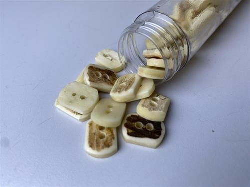 Du kan bruge knapperne til alt dit syarbejde, til en dejlig strikket cardigan, til kunstværker som øjne, som dekoration på stort som småt, som øje i en blomst, på broderier... Husk du også kan sy dine knapper i på dekorativ vis. Det kunne være med farvet tråd, i blomsterform, som et z, et kryds eller andet.