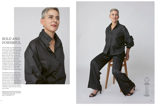 En tylbluse, bukser i kunst-ruskind, to silketoppe, en let, flydende kjole i sojajersey, en skjortekjole i viskosecrepe, en skjorte i papertouch-kvalitet samt viskosebukser med brede ben, der giver garderoben et karakterfuldt præg.