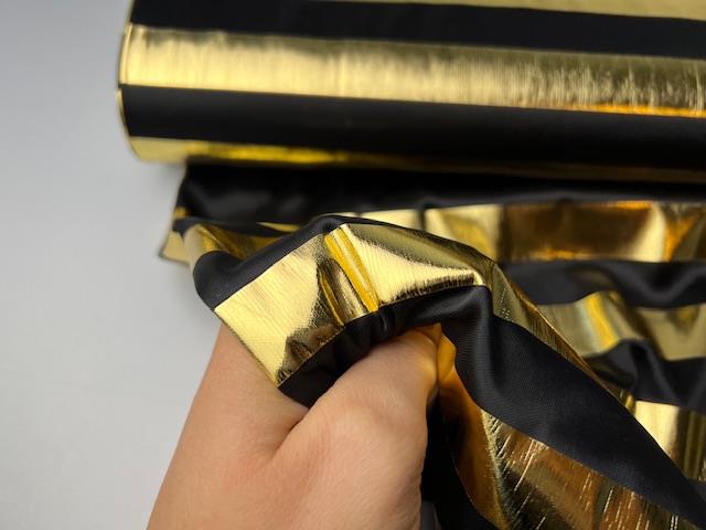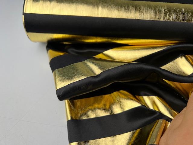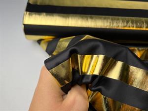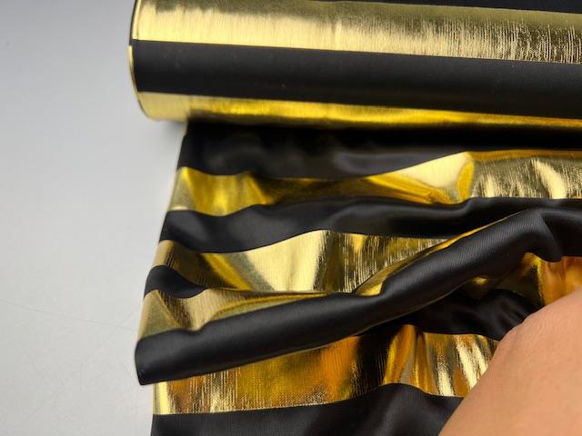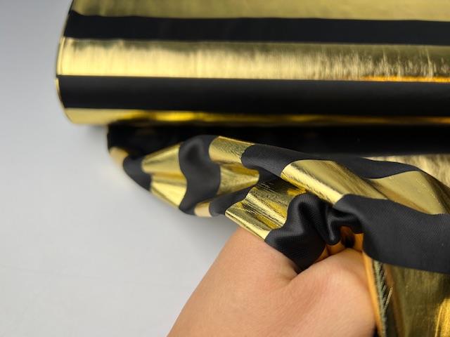 Strikket polyester sag med flotte striber i guld og sort. Stoffet løber ved stræk. Der ydes derfor ingen garanti på holdbarheden af foil - sprød pris og oplagt til udklædning.
