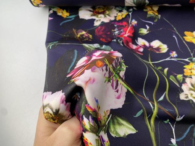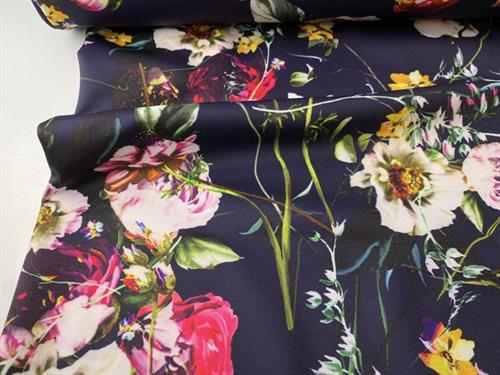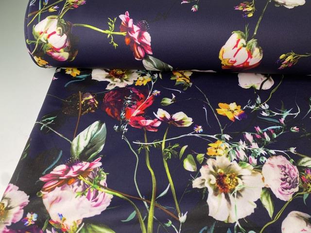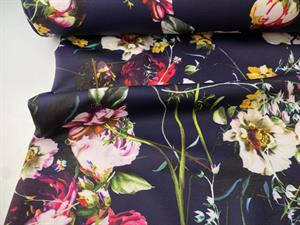 Polyesterjersey - smukke blomster på mørk blåviolet bund