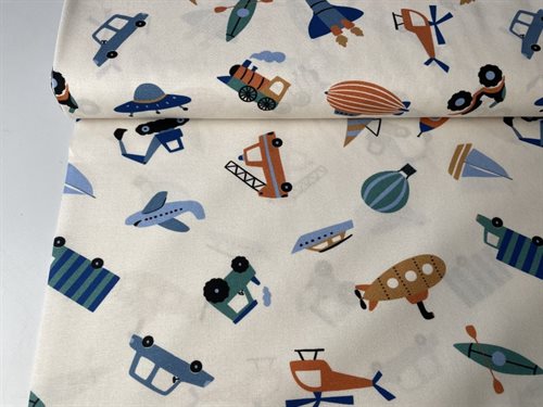 Poplin - maskiner til lands og til vands. Her er flyvemaskine, luftballon, drage, raket, både, helikopter, ubåd og meget mere.