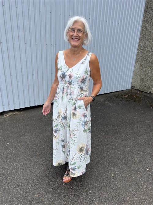 Stoffet til Bentes kjole er en fantastisk kvalitet fra Italien i 100% hør. Varenummer er H572.
