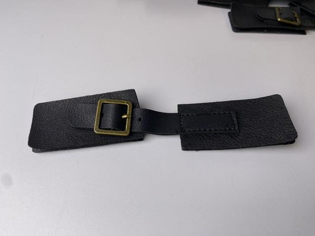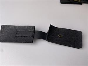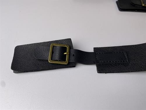 Lukke anordning i sort læder look. Bredden på båndet er ca. 15 mm. Firkanterne måler ca. 65 mm x 32 mm.