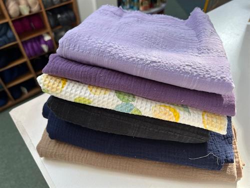 Bomuldsjersey, isoli, fastvævet viscose, hør, poplin, fastvævet bomuld, fleece, gauze og fløjl