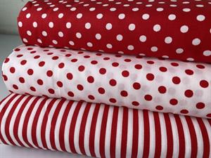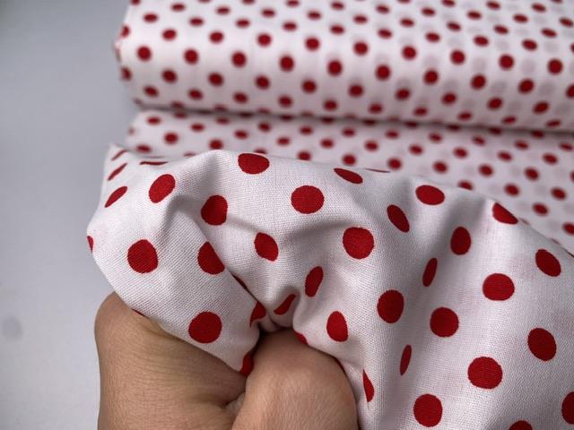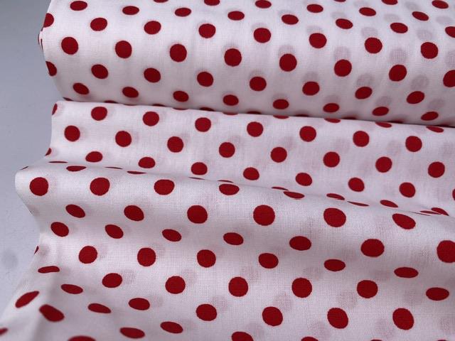 Vævet bomuldspoplin - hvid med røde prikker