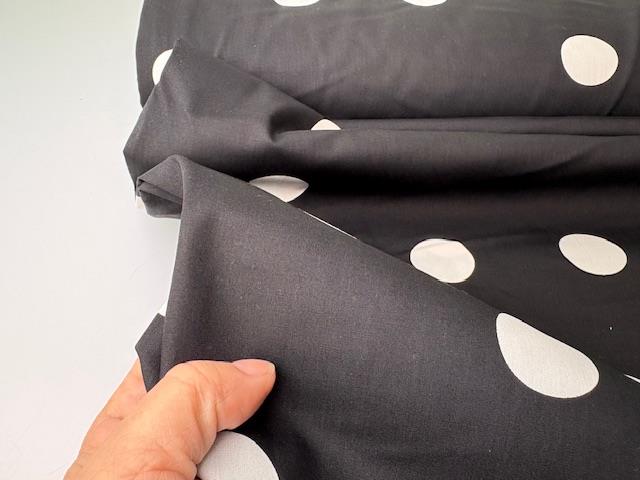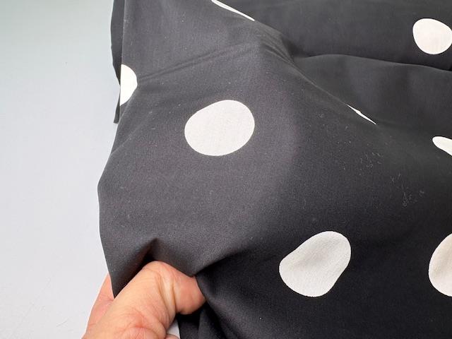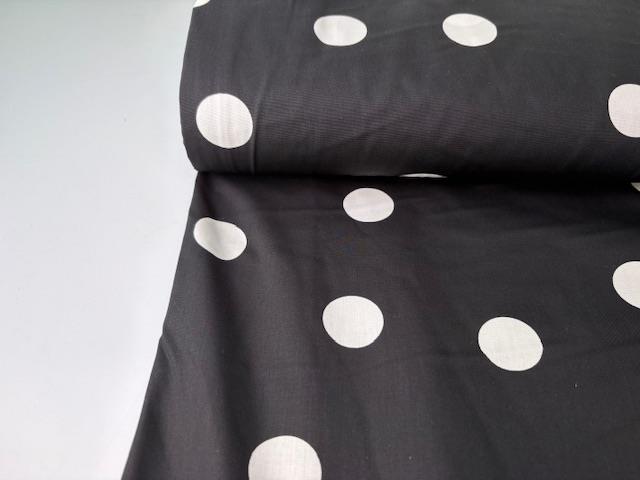 Vævet bomuldspoplin - hvide polkaprikker på sort bund