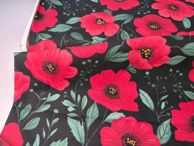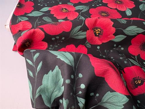 Vævet bomuldspoplin - smukke valmuer på sort bund