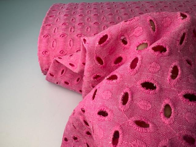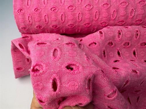 Skøn fastvævet hørblanding i en lækker kvalitet. Stoffet har det smukkeste udtryk med sit skønne hulmønster. Stoffet er ideelt til beklædning.
