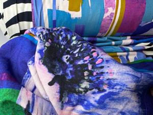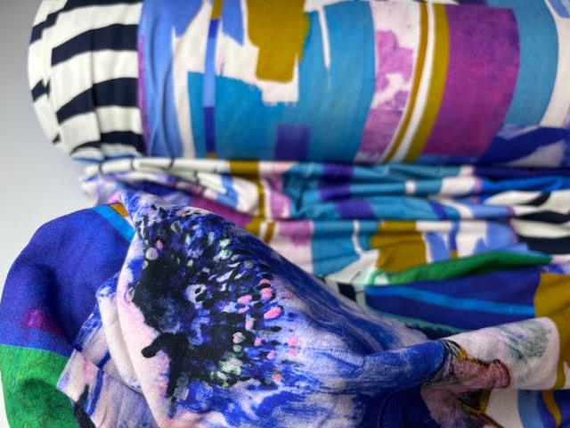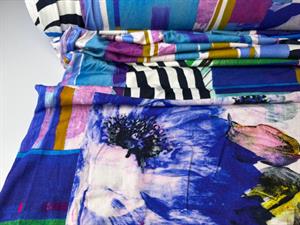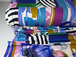 Viscosejersey - abstrakt i lilla og kobolt, fantastisk