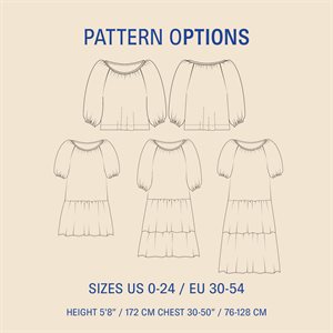 Moira Blouse er en romantisk og feminin bluse med rynket halsudskæring med bindebånd, raglanærmer og en afslappet pasform. Dette begyndervenlige mønster er perfekt til at skabe smukke, lette og flydende bluser i lette, vævede stoffer.