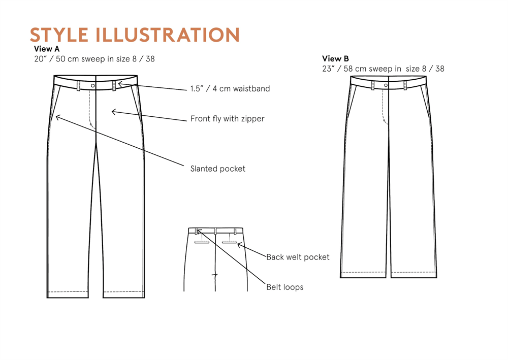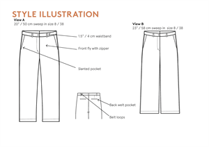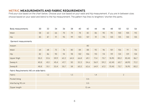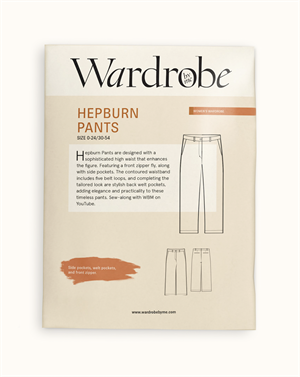 Hepburn-buksemønstret er den perfekte kombination af elegance og komfort. Sy Hepburn-bukserne i en fastvævet kvalitet med lidt stræk, som f.eks. bomuldstwill, bomuldsatin, denim eller hør. Bukserne har en formet linning, lynlåsgylp, skrålommer, indsnit bagpå og paspolerede baglommer. De sidder til fra talje til hofte og har brede ben fra hoften og ned til gulvet. Mønstret inkluderer størrelser 0–24 / 30–54.